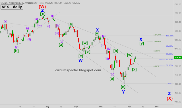 Zodra de blauwe X is geplaatst mag de AEX weer afzakken richting de low van eind vorige maand.
